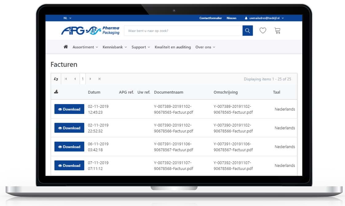 Op de dag dat de goederen uit ons magazijn vertrekken verzenden wij de factuur digitaal. In de meeste gevallen ontvangt u uw goederen binnen de volgende werkdag. Alle facturen zijn te vinden zijn onder 'Facturen' binnen de module Transacties. U vindt alle offertes op één plek met bijbehorende informatie, zoals: